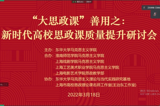 3月18日,值习近平总书记在学校思想政治理论课教师座谈会上发表重要讲话3周年之际,由东华大学马克思主义学院主办的“‘大思政课’善用之:新时代高校思政课质量提升”教学研讨会在“云端”召开。与会者共议提升新时代高校思政课质量的路径与成果,推进学习和贯彻习近平总书记关于善用“大思政课”的讲话精神。