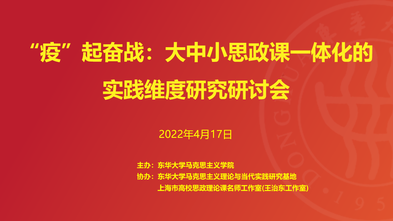 2022年4月17日,由东华大学马克思主义学院主办、东华大学马克思主义理论与当代实践研究基地、上海高校思想政治理论课名师工作室(王治东工作室)承办的“‘疫’起奋战:大中小思政课一体化的实践维度研究”学术研讨会召开。十余位来自教育研究机构、教育局、高校、中小学的专家学者参加了此次研讨。研讨会分别由东华大学马克思主义学院院长王治东教授、《上海宣传通讯》编辑部主任吕东卉主持。 在开幕致辞中,上海市教育科学院德育院(筹)党支部书记、副院长宗爱东指出,在大中小思政课一体化中旗帜鲜明讲实践维度是非常有意义和有价值的。松江区在大中小思政课一体化实践中积累了丰富的经验,在整体设计上架构完善,层次清晰,内容务实。当前需要进一步深化落实的是,一是把习近平新时代中国特色社会主义思想概论课程开好,在高校和中小学都要形成特色鲜明的成果。二是要把伟大抗疫精神融入大中小思政课一体化建设当中,在同一个主题中体现不同的层次,体现螺旋上升。三是把中小学的实践教育智慧与高校的理论凝练、归纳与宣传的优势相结合,加速人才的培养。四是围绕大中小思政课一体化建设在制度上出经验,激活各方动力,使一体化建设形成常态。 在主题研讨阶段,松江区教育局宣传德育科副科长杨立东对《松江大中小思政课一体化建设三年行动方案(2021-2023年)》的主要任务和开展一年来的成果进行了回顾和介绍。以松江的实践为基础,对大中小思政课一体化区域协同研究进行了概述。上海外国语大学松江外国语学校党支部书记王吉群对学校新形势下师资队伍建设、联合教学活动、特色思政课程体系建设进行了概述,并对学校疫情期间上好大思政课所开展的系列主题活动、实行的全员导师制进行了经验分享。东华大学附属实验学校党支部书记张丽群对四大特色系列思政课程从筹备、内容、实施、效果等方面进行了详细解读,并对未来的纵向深入探索与横向区域拓展进行了展望。东华大学附属实验学校副校长瞿斌着重从红色文化进附校实体课和“童心向党师说百年”两个课程出发阐述了大中小思政课一体化建设的实践探索。东华大学马克思主义学院曾瑞明教授认为,大学思政课破解抬头率和点头率的困局,要进行思政课课堂改革,并向中小学学习。东华大学马克思主义学院副院长陈向义教授认为,大中小思政课一体化建设中要重视体系意识,用好“大思政课”。东华大学马克思主义学院教师王不凡、张乂凡、田锋分别从教学互动对线上思政课教学的规律性把握、中国共产党精神谱系融入思政课教学实践、通过“四史教育”推进大中小思政课一体化建设的措施进行了讨论。 《上海宣传通讯》编辑部主任吕东卉认为松江区的大中小思政课一体化体系建设既关注实践又能感受到明显的理论力量,希望注重理论与实践结合的一体化建设结出更多更好的成果。 东华大学马克思主义学院院长王治东教授在总结时表示,此次研讨会结构代表了整个大中小的微型结构,这种微型结构蕴含着推进大中小思政课一体化建设蓬勃发展的主体力量,既有管理架构、研究架构,也有实践推进承接的组织架构,从实践出发关注问题,回应问题,此次研讨会对于推动大中小思政课一体化发展具有重要意义。 撰写:张乂凡 |
