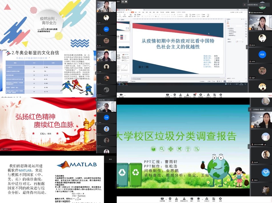 线上教学进行时,“疫”起奋发向未来,为有效应对新一轮新冠疫情,3月12日起学校全面切换为“在线教学模式”,对此马克思主义学院高度重视,针对思政课的教学特点和实际情况,学院层面、教研室层面、教师层面等“两级三层”齐发力,切实做好统筹领导、组织落实和自主探索,多维度保障“云端”教学工作,积极推进在线思政课。 学院层面精心部署,在线教学推进有力有序 思政课具有选课学生多、覆盖面广的特点,前8周涉及本科生思政课教学班级就有182个,学生人次超过12000人,如何有效开展线上教学来落实立德树人根本任务对于马克思主义学院教学工作是一个不小的挑战。接到学校启动在线教学通知后,马克思主义学院第一时间做好部署安排,紧急召开线上全院大会做好思想动员,指明思政课在线教学推进原则,即要切实强化政治站位,筑牢意识形态底线,充分发挥思政课对于学生价值引领作用,在原有在线教学工作推进基础上,充分发挥学院自身特色,有效运用在线教学平台功能,力求线上课堂授课生动、形式多样、互动高效,切实帮助学生在校封闭期间学习成长。3月18日,在习近平总书记在学校思政课教师座谈会发表重要讲话三周年之际,马克思主义学院召开“‘大思政课’善用之:提升新时代高校思政课质量”专题研讨会,结合当前线上教学进行专题研讨,各老师积极交流在线教学的心得体会和困惑,邀请资深专家点评指导,有力促进思政课在线教学工作展开。 学院层面还进一步细化思政课教学管理,每天做好在线教学提醒,确保教师工作不掉线。定期召开教研室主任会议,收集大家对线上教学的意见和建议,了解线上教学过程中存在的困难和问题,共同探讨相应的解决方案。学院在线教学专项工作小组成员每周随机开展在线督导检查,及时查找、改进问题,不断提升在线教学课堂质量。
