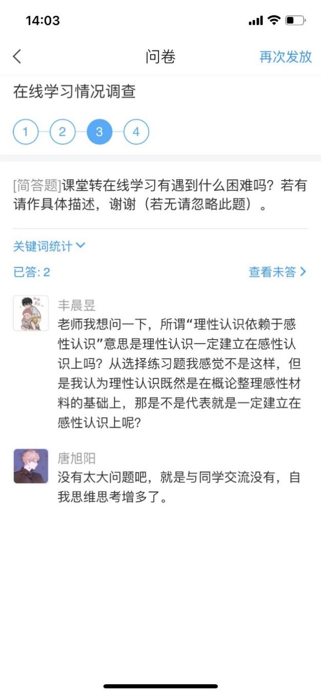 教研室教学资料共享 教师层面各显神通,在线教学互动有声有色 在线教学最终要落实到教师讲课上来,在网络条件下,如何做好实时互动,随时解决学生听课中遇到的问题,考验着马院教师的智慧。思政课教师“各显神通”,大力加强学习互鉴,根据自身实际情况,切实抓好课前准备、课中讲授、课后反馈等环节,创新探索在线教学的有效方式。中国近现代史纲要李天星老师表示线上课程应当根据网络优势加强教学设计,注重问题导向,提前设置高阶性、开放性的讨论题目,教学内容紧密围绕新教材不脱纲,有机融入新表述不模糊,及时关注新变化不滞后,精心打造教学内容保障在线教学质量。毛泽东思想和中国特色社会主义思想概论课程刘铭秋老师作为新进老师,迅速适应在线教学模式,开展“在线多元混合”教学,通过网络直播工具(腾讯会议)与超星学习通相结合的方式,即时与学生进行沟通,最大限度使用超星平台互动功能,通过 “签到”“选人”“抢答”“随堂练习” “主题讨论”等工具深入开展班级互动,通过学习通班级群进行信息反馈,促进实现师生、生生之间的讨论与交流。马克思主义基本原理俞喆老师非常关心学生学习生活,不断给学生打气,做好安抚和疏导,帮助他们尽快适应线上教学,特别注重学生的课堂教学反馈,针对不同学生学习进度灵活安排教学内容,开展“马克思主义原理学生问题集”汇编工作,收集、分享有典型性、可作深入分析的学生问题,用“从学生中来到学生中去”的方法,把原理讲活讲透。学院老师们积极发挥主观能动性,部分老师努力克服网络、设备、环境等条件限制,通过微信、QQ群、学习通、腾讯会议等多种平台,想方设法加强课堂互动,切实提升思政课在线教学活力。