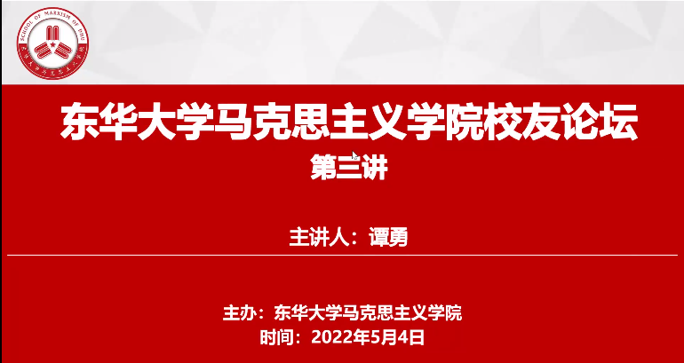 5月4日,在五四青年节之际,东华大学马克思主义学院校友论坛第三讲通过腾讯会议顺利举行,本次论坛主讲人是学院19届硕士毕业生、南开大学博士、兰州大学青年教师谭勇,讲座主题为“科研素养提升及论文写作技巧”。学院党委书记戴叶萍、院长王治东出席,学院全体学生参加,讲座由专职辅导员于小越主持。