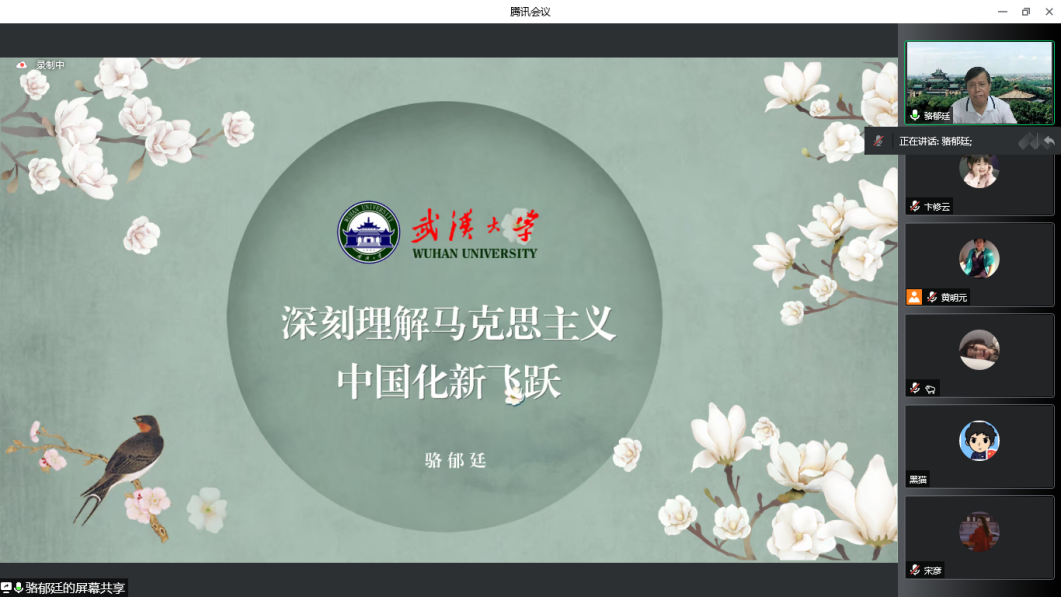 当天上午,武汉大学党委原副书记、国务院学科评议组专家、中央马工程首席专家、教育部重大项目首席专家骆郁廷教授受邀作了题为《深刻理解马克思主义中国化新飞跃》的学术报告。 骆郁廷教授从马克思主义中国化的飞跃是发展的历史跨越、马克思主义中国化新飞跃是第三次历史飞跃、马克思主义中国化新飞跃是理论与实践的突破、马克思主义中国化新飞跃是新时代的新跨越四个方面展开。他指出,马克思主义中国化新飞跃是以第一次飞跃为前提、第二次飞跃为基础而得以升华的,实现了新时代理论与实践相统一的飞跃,开辟了理论与实践发展的新境界,并鼓励大家要明确自己作为新时代年轻人的责任和担当,要以马克思主义中国化新飞跃的创新理论成果和创新实践成果为指导,助力全面建成社会主义现代化强国,实现中华民族伟大复兴,完成中国由世界大国向世界强国的转变和跨越。 学员纷纷表示学术报告拓展了学术视野,切实感受到东华大学马克思主义学院良好的学术氛围。