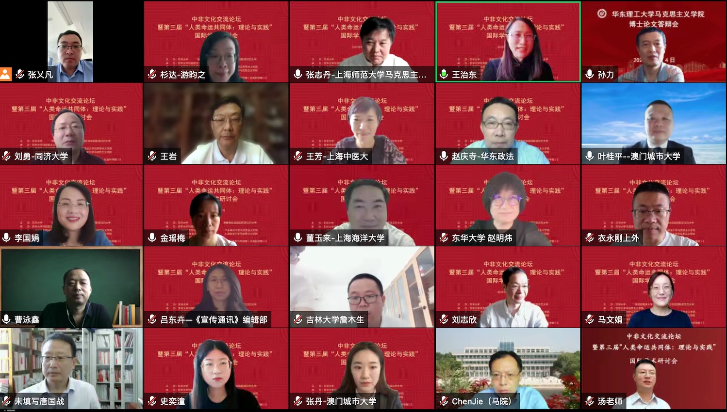 上午9时,研讨会在腾讯会议线上举行。本次国际研讨会的合办单位有上海师范大学马克思主义学院、华东政法大学马克思主义学院、上海工程技术大学马克思主义学院、上海海洋大学马克思主义学院、信阳师范学院马克思主义学院,协办单位有东华大学马克思主义理论与当代实践研究基地、上海市习近平新时代中国特色社会主义思想研究基地东华大学基地、上海高校思政课名师工作室(王治东工作室),《毛泽东邓小平理论研究》《上海宣传通讯》《东华大学学报(社会科学版)》作为支持期刊参会。会议分为主旨发言会场和4个分会场,来自全国各地的线上参会人员有120多人。研讨会由分论坛主席、东华大学马克思主义学院院长王治东教授主持,她指出,中非文化交流论坛在第三年发生了整体结构性的改变,研究议题的增长性和专家学者的关注度较之以往有了新的突破,这也得益于多方的支持和参与。论坛关注年轻学者的成长,四个分论坛中有两个是提供给青年学者的。本次论坛收到了66篇稿件,经评委会评审,评出论文一等奖5人,二等奖8人,三等奖10人,优秀奖17人。