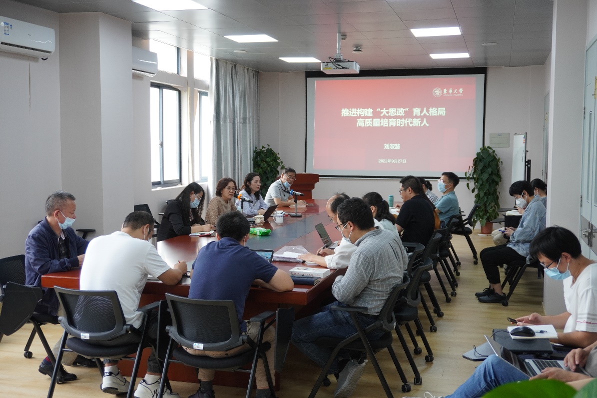 9月27日下午,学校党委副书记刘淑慧以“推进构建‘大思政’育人格局,高质量培育时代新人”为主题,为马克思主义学院思政课教师讲授专题党课。学院领导班子成员及思政课教师现场听课,党课由学院党委书记戴叶萍主持。