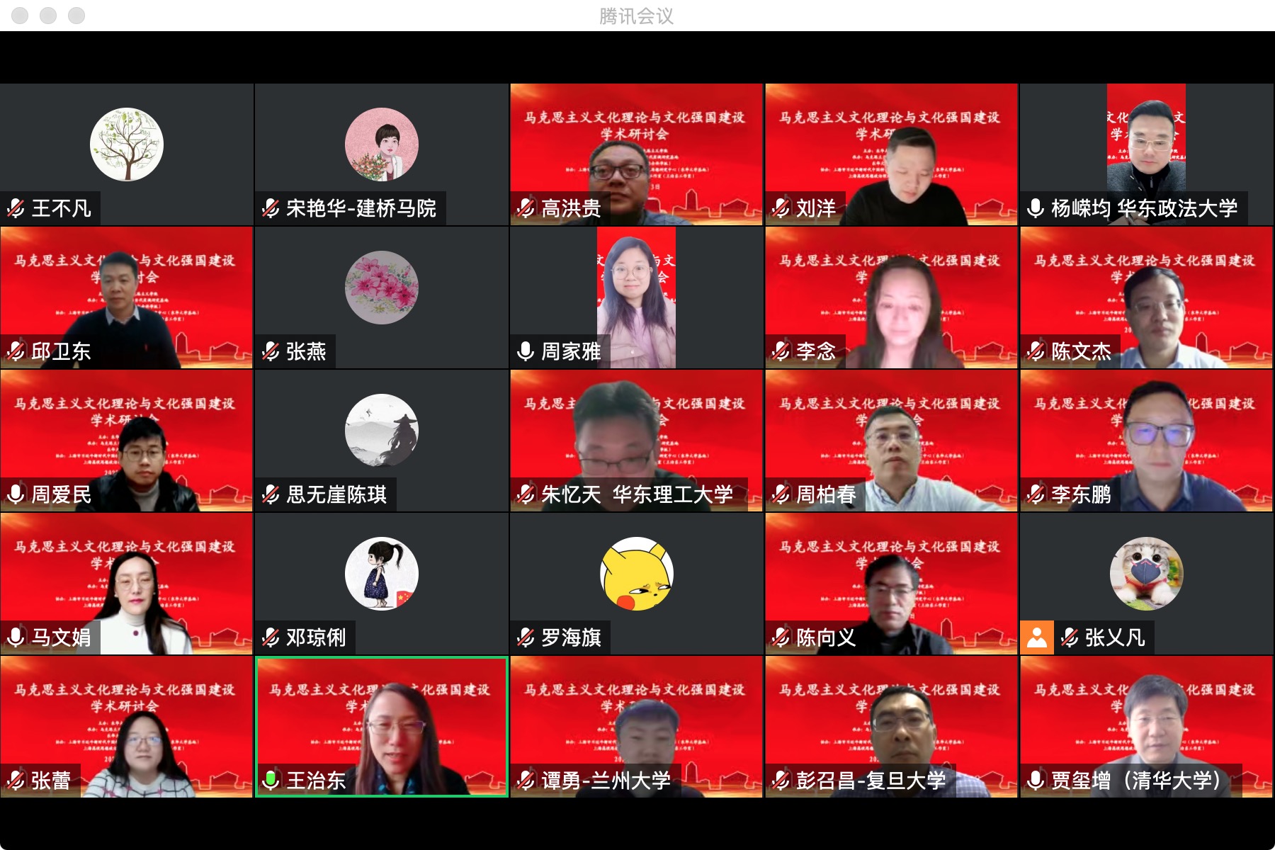 为坚定新时代文化自信自强、推动中国特色社会主义文化强国建设的理论研究,进一步加强学术与现实生活的结合,12月3日,东华大学马克思主义学院在线上召开了“马克思主义文化理论与文化强国建设”学术研讨会。来自清华大学、复旦大学、上海交通大学、同济大学、华东理工大学、上海财经大学、上海大学、华东政法大学、兰州大学、浙江农林大学、上海建桥学院、上海工艺美术职业学院、山东工商学院、上海音像资料馆等十余所高校、研究机构、媒体单位的50多位师生齐聚“云端”参与本次学术研讨会。与会专家和学者聚焦“马克思主义文化理论与文化强国建设”的重要理论和实践问题展开研讨,提出了一系列前沿性的学术观点。