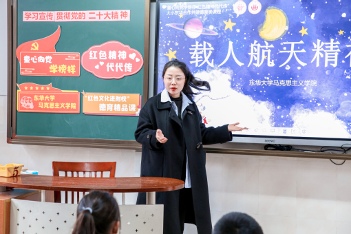戴叶萍在会上对附校一直以来为马院研究生搭建思政教育教学实践平台表示感谢。她谈到,学院将继续发挥专业优势,引导研究生进一步用好数字化技术,除了做好线下实体课堂备课外,也将同步开发配套云课程,融入更多社会大课堂资源,推动“大思政课”的课堂真正大起来、视野真正宽起来、内容真正活起来。新一轮合作将把东华附校试点成熟的精品课程进一步辐射小昆山分校,让更多附校学子受益。 王治东表示,大中小思政课一体化建设是一项系统工程,除了自上而下的顶层设计推动,也需要自下而上的基层试验与探索。大小东华思政共建合作之所以能不断深入,在于双方坚守的育人信念一致,始终坚持用信仰与情怀讲好思政大课,合力画好协同育人“同心圆”。她希望通过马克思主义学院的优质平台与丰富资源辐射附属学校,再通过东华附校在松江区大中小学思政课一体化联盟盟主的作用带动更多中小学,总结“东华经验”,树立“东华典型”。 张丽群谈到,附校学子在“红色文化进附校”共建项目的系列课程中受益颇多,学生教育载体更丰富,教师成长平台更广阔,德育课程更加多元化。她希望能进一步依托马院优势资源,夯实中小学初中道德与法治教师队伍的日常培训,通过大中小思政课的“同课异构”,不断完善附校思政课主阵地的教学内容丰富性、课程实施方法的多元性、与现实结合的紧密性。 这样的思政课共建合作,从2019年项目启动以来,已经走过了三年多时间。即使在疫情防控期间,马克思主义学院通过数字化技术为附校学子录制微课,做到“停课不停学,红色教育不停歇”。2021年,《童心向党学榜样 红色精神代代传》大中小学思政课一体化精品课程案例入选《上海市普教系统庆祝建党100周年百个优秀案例》,成为大小东华思政合作继续深化的新起点。 “大家对快递都很熟悉,我们来猜一猜地球到太空的快递需要多久呢?”教室里,小学生的耳朵竖得高高的,盯着讲台上的研究生“大姐姐”,眼神中充满期待。原来是马克思主义学院11名研究生带着准备一个月之久的“载人航天精神”红色文化课程,走进东华附校三年级,带来的一堂有学有思、有议有悟的“大思政课”。课堂上,马克思主义学院研究生通过紧扣教学重点的新闻视频素材、贴合青少年的生动课件以及恰到好处的问题预设,激发学生的思考,内化学生心中对航天英雄的崇敬,继而转为自身孜孜求学、报效祖国的远大志向。