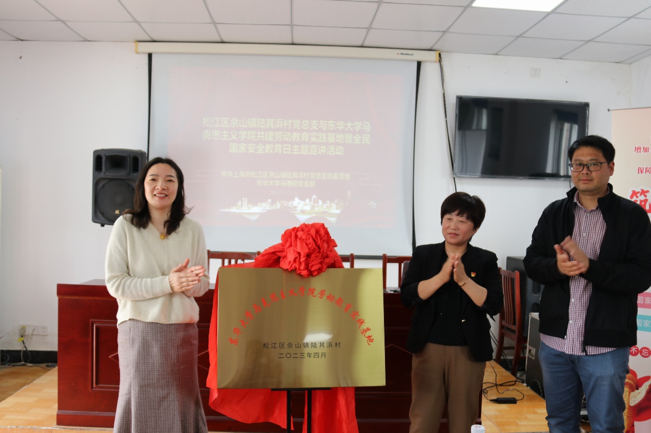4月14日下午,东华大学马克思主义学院组织师生赴松江区佘山镇陆其浜村共建劳动教育实践基地,在陆其浜村委会举行揭牌仪式。学院党委书记戴叶萍,陆其浜村党总支书记、主任徐萍、出席活动致辞,并为实践基地揭牌。活动由陆其浜村党总支委员、副主任蔡毓豪主持,陆其浜村委及马克思主义学院相关负责人、研究生及村民代表参加。