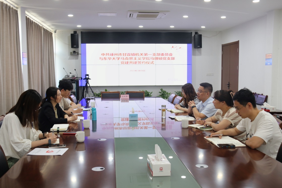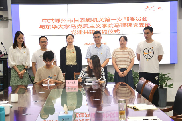 为深入开展学习贯彻习近平新时代中国特色社会主义思想主题教育,进一步学深悟透习近平新时代中国特色社会主义思想,体悟党的创新理论的真理力量和实践伟力,7月18日上午,马克思主义学院马理硕党支部赴浙江绍兴嵊州市,与甘霖镇机关第一支部签署合作共建协议。学院党委书记戴叶萍、甘霖镇党委副书记楼利洪,马理硕支部成员和甘霖镇党建办负责人等参会。 楼利洪对马克思主义学院师生表示热烈欢迎,介绍了甘霖镇遵循习近平总书记嘱托,以建设“富乐甘霖”党建品牌为抓手,致力于打造共同富裕先行示范乡镇,在党建引领经济社会高质量发展各方面取得的突出成绩,希望通过与高校党建联建,加强理论学习、文化传承、人才培育等方面合作交流,共同推进党建工作高质量发展。