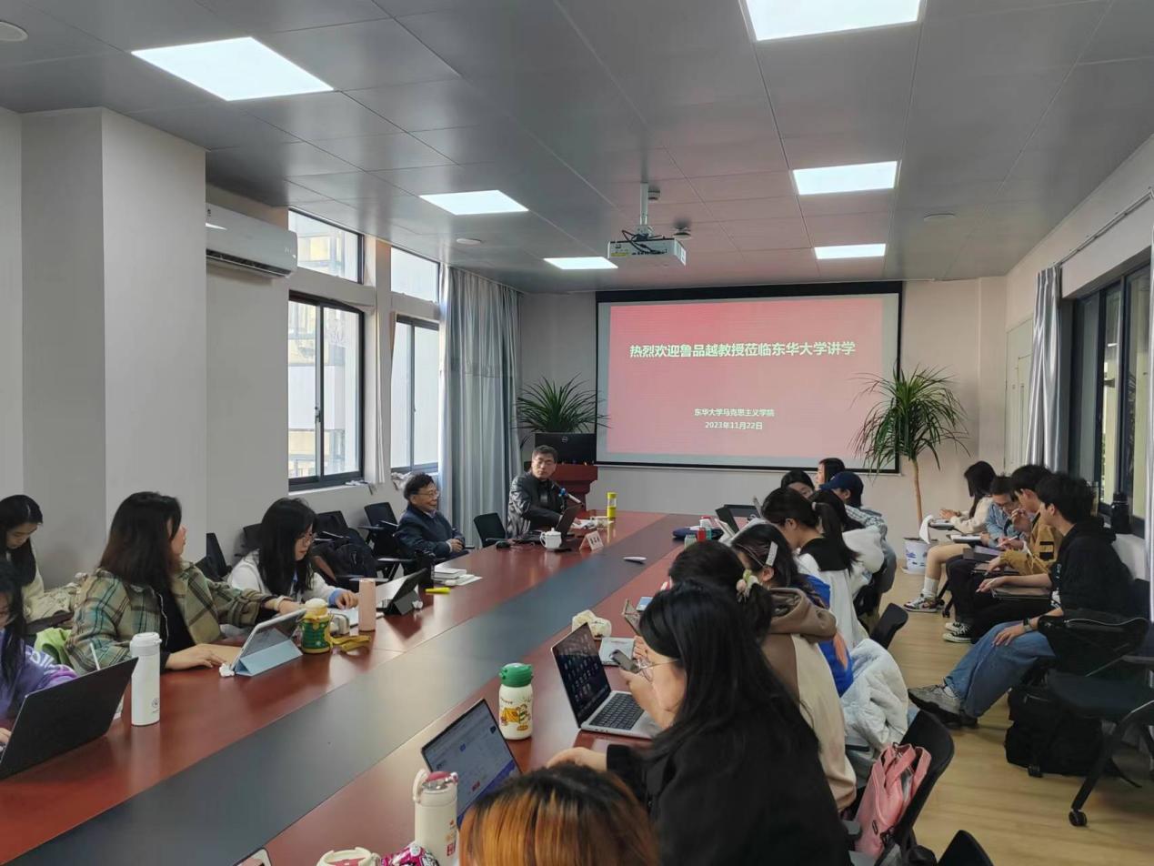 2023年11月22日上午,东华大学马克思主义学院邀请上海财经大学首批资深教授、上海市习近平新时代中国特色社会主义思想研究中心特聘研究员、首批上海市思想政治理论课“教学名师”、突出贡献获奖者鲁品越教授进行一场主题为“《资本论》与当代世界”的讲座。讲座由副院长陈向义教授主持。学院研究生和部分青年教师参加了此次讲座。