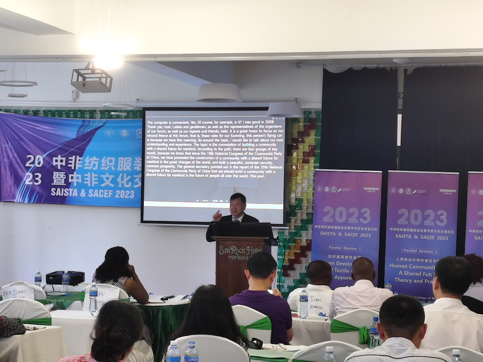 (颜晓峰教授受邀作主旨演讲) 2023中非文化交流论坛暨第四届“人类命运共同体:理论与实践”国际学术研讨会属于第九届中非纺织服装国际论坛暨中非文化交流论坛(以下简称“中非论坛”)平行论坛之一。“中非论坛”由东华大学、肯尼亚莫伊大学、泉州师范大学、德国拜罗伊特大学共同主办,中国日报(China Daily)作为媒体支持。论坛主题为“纺织让生活更美好”(Better Textiles, better life)。论坛设立一个主论坛及三个平行论坛。论坛致辞及演讲嘉宾来自东华大学、天津大学、上海交通大学、安徽大学、中国矿业大学、华东政法大学、泉州师范学院、宁波诺丁汉大学、德国拜罗伊特大学、巴基斯坦国立纺织大学等国内外高校,联合国工业发展组织(UNIDO)、世界自然基金会(WWF)等国际组织和Rivatex东非纺织有限公司等当地企业。天津大学马克思主义学院院长颜晓峰教授应邀出席开幕式,并为论坛作了“人类命运共同体:内涵、根据、路径、态度”的主旨演讲。 本次国际学术研讨会由人民日报理论部党建历史编辑室主编、高级编辑张垚和上海交通大学马克思主义学院院长邢云文教授分别主持。邢云文教授作了题为“人类命运共同体的哲学视野”的汇报,安徽大学马克思主义学院院长吴雪琴教授作了题为“始终坚持‘两个结合’科学回答‘四个之问’”的发言,上海财经大学马克思主义学院张桂芳教授发言题目为“习近平文化思想的人类文明意义”,华东政法大学马克思主义学院院长赵庆寺教授分享了“人类命运共同体的法治逻辑”的发言,东华大学马克思主义学院曾瑞明教授围绕“科学社会主义的人类命运共同体意识”开展探讨,中国矿业大学段鑫星教授重点分析了“青年美好生活的建设之路”,东华大学马克思主义学院副院长王不凡副教授对“数字丝路助力中非共同体现代化发展的三种特征”作了讨论,华东政法大学马克思主义学院赵丽涛副教授围绕“中国式现代化的‘人民至上’逻辑”作了分析,东华大学马克思主义学院讲师张乂凡以“构建中非命运共同体的文化共兴之路”为主题作了发言。