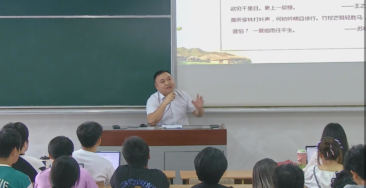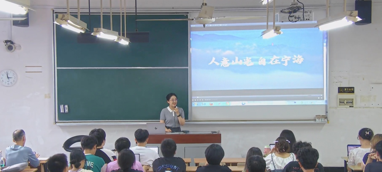 (吴育佳老师为同学讲述宁海县生态文明建设案例) 5位乡村导师分别从乡村治理、非遗传承、文化创新、绿色发展和经济转型5个维度,为同学们展现了中国式现代化进程中县域实践的出色成就。同学们时而掌声雷动、时而沉浸入神,课堂被精彩的实践案例点燃。 宁海县“缑火”青年宣讲团成员吴育佳老师以“人亦山光,自在宁海”为主题,为师生们深情讲述了宁海县双林村的故事。吴老师引领师生们穿越时空,回到了《徐霞客游记》中传奇的开篇之地——宁海县,吴老师特别提到宁海县双林村在生态环境保护、文化旅游发展以及工业转型升级等方面的成功实践。从生态治理到文化传承,从工业创新到非遗活化,每一个细节都彰显了宁海人民在新时代的奋斗精神与卓越成果。