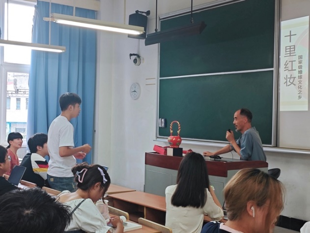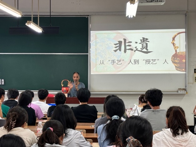 (国家级非遗泥金彩漆传承人陈龙老师在课堂与学生互动) 国家级非遗泥金彩漆传承人陈龙老师,携带着他亲手制作的作品登场。陈老师在课堂展示了多件获奖泥金彩漆作品图片,这些非遗作品一下子就把同学们的兴趣提了起来,其精湛工艺令同学们赞叹不已,课堂被燃动起来。陈老师强调:“保护与传承非遗不仅是责任,更是对文化的尊重与延续。”他呼吁在座师生关注并参与非遗保护,共同为中华优秀传统文化的传承与发展贡献力量。