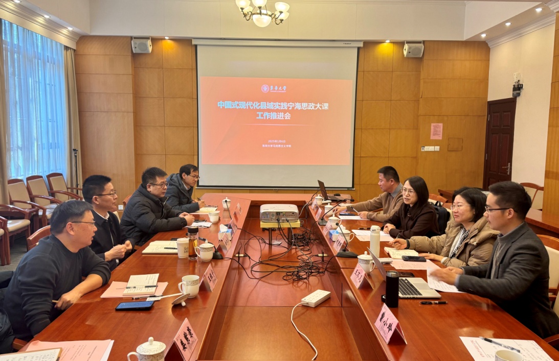 1月6日上午,中国式现代化县域实践宁海思政大课工作推进会在延安路校区召开。宁海县委常委、宣传部部长徐旭东,我校马克思主义学院院长王治东出席。宁海县委宣传部常务副部长叶挺,宁海县委宣传部副部长、县政府新闻办主任王银宁;我校党委宣传部副部长刘雯玮、马克思主义学院副院长王不凡、校团委副书记董晓光等参加会议。