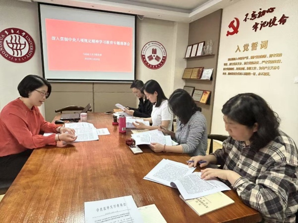 会上,林惠英组织大家认真学习了《中共东华大学委员会关于开展深入贯彻中央八项规定精神学习教育的实施方案》,结合《关于在东华大学基层党组织和全体党员中开展“全面推进党建与事业发展深度融合,为‘奋进东华’高质量发展行动奋力一跳、勇立新功”主题活动的通知》,传达部署了学校关于开展深入贯彻中央八项规定精神学习教育的要求,并结合实际案例,要求师生干部、党员要深刻领会学习教育的重要意义,锲而不舍贯彻中央八项规定精神,进一步密切联系群众,发挥党员先锋模范作用,高质量完成学习教育目标任务。指出要将学习教育与学校年度党建主题活动紧密结合,立足岗位,担当作为,为进一步推进“奋进东华”高质量发展行动、加快建设教育强国提供坚强有力保障。