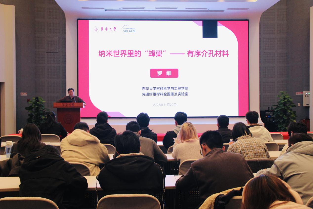 从自然界的蜂巢结构到人工设计的“纳米蜂巢”,有序介孔材料是否将成为下一代材料革命的关键?微观结构如何作用于宏观性能?11月20日,东华大学材料科学与工程学院研究员、国家杰出青年科学基金获得者、上海市青年拔尖人才罗维教授登上《锦绣中国》课程讲台,以“纳米世界里的‘蜂巢’——有序介孔材料”为题,带领师生走进纳米微观世界,探秘介孔材料在能源、环境、生物等领域的广阔前景,阐释材料科学服务国家战略需求的使命担当。