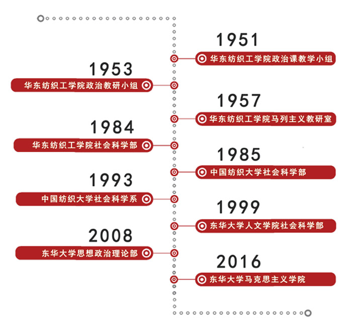1951年10月,学校成立之初即设立政治课教学小组,归属公共课程部,开设社会发展史等马列主义课程。1953年10月,政治课教学小组改名为政治教研小组,归校政治辅导处领导。1957年5月,学校成立马列主义教研室,直属学校党委领导。1980年2月,开设马列主义基本原理课。从此,马列主义理论教育开始走上了系统化和规范化进程。1984年5月,学校撤销马列主义教研室,建立社会科学部。社会科学部下设哲学、政治经济学、中共党史3个教研室和1个图书资料室。1993年3月,学校将社会科学部改为社会科学系。1999年7月,社会科学系改制为人文学院,承担马克思主义理论教学的3个教研室和德育教研室共同组成社会科学部。2008年,设立东华大学思想政治理论部,成为相对独立的二级机构。2016年,成立东华大学马克思主义学院,以学院建制进行相关建设。